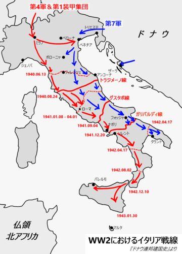 前史 WW2 エーデルワイス作戦(1940年5月15日~6月12日) トラジメーノ線(1940年6月13日~1941年1月7日) ローマの戦い(1941年1月8日~9月3日) グスタボ線(1941年9月4日~12月19日) ガリバルディ線(1941年12月20日~1942年4月16日) 南イタリア・シチ…